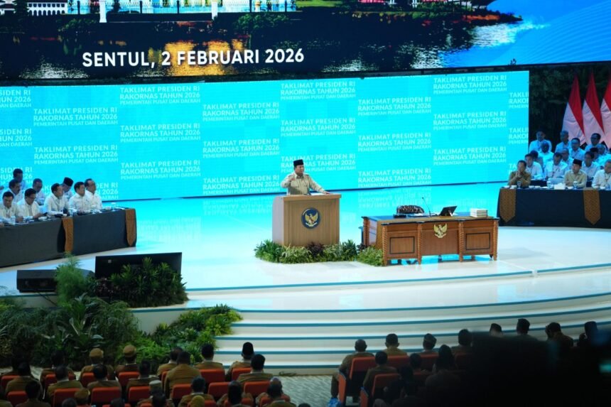 Jawa Barat, beritakitanew.com — Arahan strategis Presiden RI Prabowo Subianto kepada jajaran pemerintahan daerah sebagai bagian dari koordinasi nasional didengar secara langsung oleh Bupati Banyuasin, Dr. H. Askolani, S.H., M.H dan Wakil Bupati Banyuasin, Netta Indian, SP. Rapat Koordinasi Nasional (Rakornas) Pemerintah Pusat dan Daerah Tahun 2026 digelar di Sentul International Convention Center (SICC), Bogor, Jawa Barat, Senin, (2/2/2026).