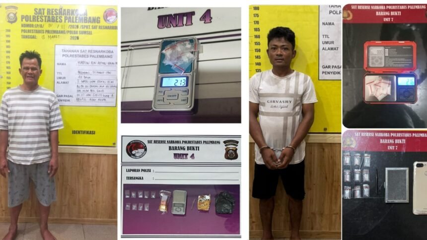 Pada Jumat (13/3/2026), Satresnarkoba Polrestabes Palembang berhasil mengungkap dua kasus peredaran narkotika jenis sabu dalam satu hari operasi dengan menangkap dua tersangka di wilayah berbeda di Kota Palembang.